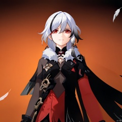Onyx Simurgh, long hair, bangs, white hair, red eyes, hair between eyes, smile, black hair, multicolored hair, streaked hair,low-tied long hair,feathers,gloves,fur collar,shoulder