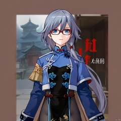 Valkyrie Accipiter,hair between eyes,blue eyes,grey hair, blue hair, long hair,low-tied long hair, long sleeves, blue jacket, jacket, glasses, chinese clothes,red_framed_eyewear