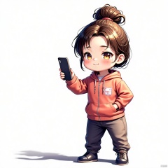 gongfu, Powder blusher, brown hair, single person, holding, hood, 1 girl, phone, white background, long sleeve, simple background, ponytail, pants, in the office, computer, whole body, standing, mobile phone, child, smile, elderly down jacket, hoodie, single bun, mouth closed, hood worn, girl, brown eyes,