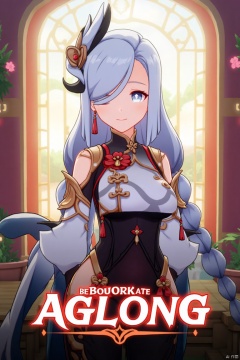 1girl, solo, upper body, very long white braided hair with a braided ponytail, hair over one eye, bangs, blue eyes, looking at viewer, blush, smile, parted lips, hair ornament, tassel earrings, tassel, bodysuit with gold trim, clothing cutout, flower, Shenhe (Genshin Impact) style, movie poster, three-dimensional text AGlong in the middle below, cinematic lighting, dynamic composition, detailed background with poster theme, high contrast, sharp focus, dramatic atmosphere. The girl stands confidently, her pose emphasizing the bodysuit's cutout and gold trim, with a flower accentuating her outfit. The background features a vibrant, themed setting, enhancing the cinematic feel. The text AGlong stands out in bold, three-dimensional form, adding to the dramatic poster design.