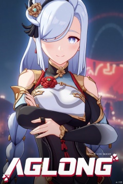 1girl, solo, upper body, very long white braided hair with a braided ponytail, hair over one eye, bangs, blue eyes, looking at viewer, blush, smile, parted lips, hair ornament, tassel earrings, tassel, bodysuit with gold trim, clothing cutout, flower, Shenhe (Genshin Impact) style, movie poster, three-dimensional text AGlong in the middle below, cinematic lighting, dynamic composition, detailed background with poster theme, high contrast, sharp focus, dramatic atmosphere. The girl stands confidently, her pose emphasizing the bodysuit's cutout and gold trim, with a flower accentuating her outfit. The background features a vibrant, themed setting, enhancing the cinematic feel. The text AGlong stands out in bold, three-dimensional form, adding to the dramatic poster design.