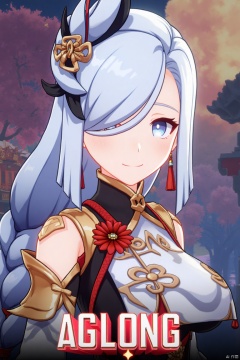 1girl, solo, upper body, very long white braided hair with a braided ponytail, hair over one eye, bangs, blue eyes, looking at viewer, blush, smile, parted lips, hair ornament, tassel earrings, tassel, bodysuit with gold trim, clothing cutout, flower, Shenhe (Genshin Impact) style, movie poster, three-dimensional text AGlong in the middle below, cinematic lighting, dynamic composition, detailed background with poster theme, high contrast, sharp focus, dramatic atmosphere. The girl's confident pose highlights the intricate details of her outfit, while the vibrant, themed background and bold text create a striking cinematic poster design.