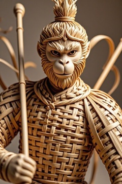Handwoven,solo,looking at viewer,fine and dense weaving of bamboo strips,creative design,bamboo silk bamboo weaving primary color,simple background,holding,upper body,weapon,sword,holding weapon,armor,blurry,no humans,helmet,polearm,holding polearm,full armor,plume,monkey king,sunwukong,a densely woven monkey king of bamboo strips,<lora:models/4414/f2697c8c.safetensors:0.8:0.8>