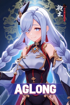 1girl, solo, upper body, very long white braided hair with a braided ponytail, hair over one eye, bangs, blue eyes, looking at viewer, blush, smile, parted lips, hair ornament, tassel earrings, tassel, bodysuit with gold trim, clothing cutout, flower, Shenhe (Genshin Impact) style, movie poster, three-dimensional text AGlong in the middle below, cinematic lighting, dynamic composition, detailed background with poster theme, high contrast, sharp focus, dramatic atmosphere, intense gaze, intricate hair details, glowing highlights, vibrant colors, ethereal glow, flowing fabric, ornate design, mystical aura, fantasy setting, bold typography, layered depth, epic scale, immersive scene.