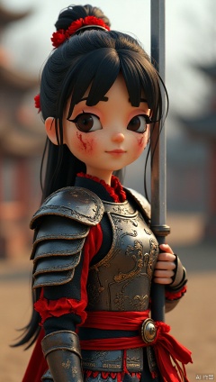 1girl,looking at viewer, full body,shot hair,black hair, holding, brown eyes, closed mouth, standing, full body, weapon,cowboy shot, outdoors, solo focus, day, sword, holding weapon, armor, black eyes, blood, facial mark, helmet, polearm, shoulder armor, spear, breastplate, blood on face, Chinese armor, facepaint, holding polearm,soldier, war, army