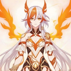 Fenghuang of Vicissitude,messy hair,jewelry,twintails,eyelashes,facial mark,head wings,two-tone hair,twintails,tattoo,ribbon,bangs,white hair,orange eyes,streaked hair,orange hair,fiery hair,hair between eyes,multicolored hair,hair ornament,hair ribbon,pattern on hair,yellow pupils,diamond shaped pupils,