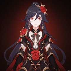 Blood Voivode, long hair, bangs, black hair, hair ornament, red eyes, hair between eyes, flower, hair flower, ponytail, red rose, jewelry, earrings, red flower, rose
