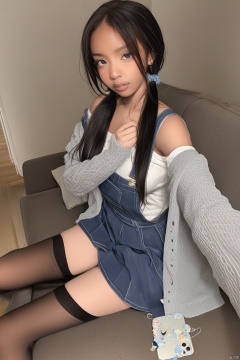 A petite girl lies on a couch, her tiny frame nestled in the curves of the plush cushion. Her long black hair cascades down her back like a waterfall, with sidelocks framing her face and a few loose strands falling between her eyes. Her twin tails are adorned with a simple hair tie, adding to the overall cuteness. The girl's extremely detailed face is topped with parted lips and a blush that suggests she's just woken up from a nap. Her purple eyes seem to hold a secret, as if she's sharing a private joke with the viewer.The soft glow of volumetric lighting casts a warm ambiance on the scene, highlighting the girl's petite body clad in a grey sweater and pleated skirt. The brown pantyhose and thigh-high socks peek out from under her skirt, adding to the overall charm. Her smartphone lies flat in front of her, as if she was just taking a selfie when she drifted off to sleep.The camera captures the scene from behind, showcasing the girl's sleeping form, with her long sleeves folded past her wrists like a gentle wave. A cardigan is draped over her shoulders, adding an extra layer of warmth and comfort. The brown pillow and cushion provide a cozy backdrop for this sweet slumbering scene, inviting the viewer to join in on the peacefulness.