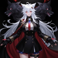 Lappland,1girl,lappland,smile,full_shot,medium_shot,highres,illustration,masterpiece, best quality, 1girl, long white hair, military-style black jacket, red cape, surrounded by 2 dark spectral wolves with red eyes, fierce expression, mystical atmosphere, ethereal wisps, dark background, front angle, high fantasy style