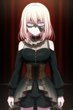 long sleeves, black shorts, black dress, dress,grey socks,kneehighs,black high heels, off shoulders, black pants, corset, choker, ascot,gold_trim, black earrings, jewelry,black_mask,
