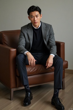 jzns, 1man,fashion model,asian,exquisite facial features,handsome,Business fashion,wearing sweater,shirt,pants,dark Pattern socks,Oxford style footwear,sitting,full body,indoors, natural  Lighting,magnificent,,masterpiece, realistic, best quality, highly detailed,wjc