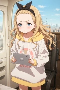 1girl,solo,long hair,blue eyes,blonde hair,long sleeves,ribbon,hair ribbon,hairband,barefoot,hood,black ribbon,hoodie,on the bed,Indoor,Window,Sunshine,city,standing,pout,Holding a tablet computer,blush,upper body,