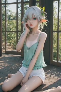 masterpiece,best quality,illustration,dark style,[Artist miwano rag],[Artist toosaka asagi],[Artist wlop],[Artist chen bin], 1girls, solo,loli,loli,loli, (little_girl:1.2),petite:1.1, elf girl,pointy_ears, small breast, green eyes, symbol-shaped pupils, cross-shaped pupils, white hair, green hair, bangs, hair ornament, gradient hair, side tonytail, nahida \(genshin impact\) ,indoor,wood house, French window, courtyard outside the window, Japanese room,sitting on floor, tan_skin,camisole, shorts,tanlines,sitting,bare collarbonea,