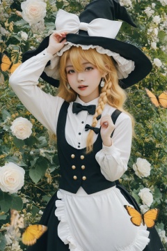 masterpiece,Realism,best quality,loli,1girl,hat,kirisame marisa,blonde hair,solo,yellow eyes,bug,witch hat,butterfly,long hair,braid,bow,flower,apron,black headwear,single braid,long sleeves,earrings,hair ornament,jewelry,white bow,hair flower,shirt,white shirt,closed mouth,hair between eyes,black bow,waist apron,white apron,hat bow,black skirt,white flower,blush,bowtie,skirt,black bowtie,looking at viewer,hair bow,rose,black vest,vest,frills,signature,buttons,hand on headwear,upper body,frilled apron,white rose,arms up,cowboy shot,yellow butterfly,arm up,hands up,artist name,side braid,ribbon,
