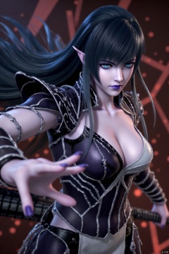 (masterpiece, best quality:1.4),finely detailed,1girl, solo, long hair, breasts, black hair, holding, cleavage, medium breasts, weapon, sword, nail polish, holding weapon, armor, makeup, purple nails, purple lips, hyur,SFQW,