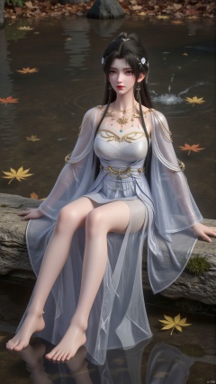 The stone. moss Clear water. Maple tree. fallen leaves. maple leaves. Leaves floating on the water surface. Leaves on the ground.