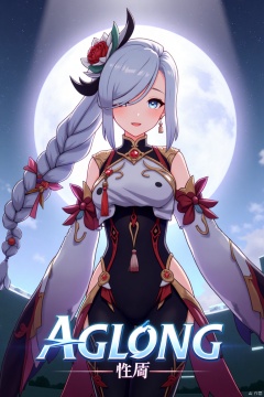 1girl, solo, upper body, very long white braided hair with a braided ponytail, hair over one eye, bangs, blue eyes, looking at viewer, blush, smile, parted lips, hair ornament, tassel earrings, tassel, bodysuit with gold trim, clothing cutout, flower, Shenhe (Genshin Impact) style, movie poster, three-dimensional text AGlong in the middle below, cinematic lighting, dynamic composition, detailed background with poster theme, high contrast, sharp focus, dramatic atmosphere, intense gaze, intricate hair details, glowing highlights, vibrant colors, ethereal glow, flowing fabric, ornate patterns, mystical aura, epic scale, bold typography, layered depth, cinematic framing, dramatic shadows, radiant glow, intricate textures, captivating expression, powerful stance, immersive setting, grand scale, artistic flair, high-definition details, striking visual impact.