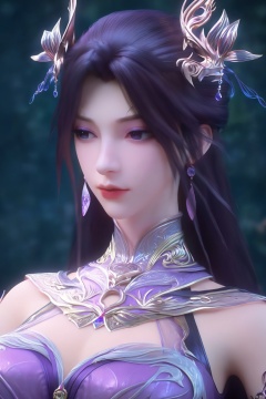 1girl, solo, long hair, breasts, hair ornament, dress, bare shoulders, jewelry, upper body, earrings, looking to the side, clothing cutout, expressionless, purple dress,