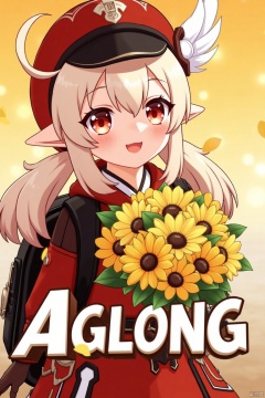 A cinematic movie poster featuring Klee from Genshin Impact, 1 girl solo, long blonde hair with bangs and hair between her eyes, twintails, and an ahoge. She has red eyes, pointy ears, and is wearing a red dress, brown long-sleeve gloves, and a cabbie hat with a feather. Klee is smiling with an open mouth, looking at the viewer, holding a bouquet of yellow flowers and petals scattered around. She has a backpack and a red headwear with feathers. The background is vibrant with a three-dimensional text AGlong in the middle below, fitting the poster theme. The framing is dynamic, with soft lighting enhancing the composition.