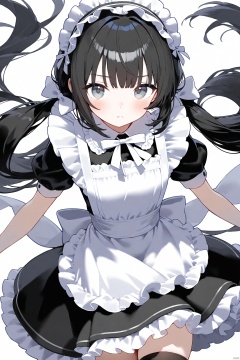 1girl, solo, long hair, looking at viewer, blush, bangs, simple background, black hair, thighhighs, white background, dress, bow, ribbon, twintails, very long hair, closed mouth, short sleeves, hair bow, cowboy shot, frills, puffy sleeves, apron, black dress, puffy short sleeves, grey eyes, maid, maid headdress, low twintails, frilled dress, white bow, white apron, maid apron, frilled apron, collared dress