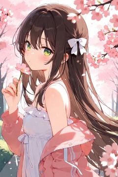 1girl, solo, long hair, looking at viewer, blush, bangs, brown hair, long sleeves, dress, bow, ribbon, holding, hair between eyes, bare shoulders, very long hair, green eyes, jacket, upper body, flower, hair bow, outdoors, open clothes, hand up, off shoulder, white dress, blurry, from side, open jacket, depth of field, white bow, cherry blossoms, blurry foreground, branch, holding flower, pink jacket