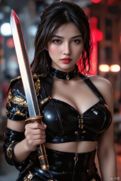 As the camera pans down from the darkening sky, a regal figure emerges, clad in black and gold armor, her dominance palpable. She holds a gleaming knife at the ready, its edge reflected in the wet, glistening surface of her large natural breasts. A hazy mist dances around her, infused with the eerie glow of the blood-red track etched across the sky. With a swift, calculated motion, she flicks the knife, unleashing a burst of vibrant red energy that illuminates the darkening landscape. The camera captures every intricate detail, from the water droplets glistening on her skin to the Zeiss Otus 85mm F1.4 lens rendering the scene in breathtaking high-definition.,huge Breasts,cleavage,1girl,dlrb,AIDMAFLUXPROULTRA,REFINEDBEAUTY_DA,LARGE NATURE BREASTS,COLORFUL CHAOS CRACKS AND DROPS,RAINBOW GLOW.,hkbeauty,NEWFANTASYCORE,DETAIL FACE