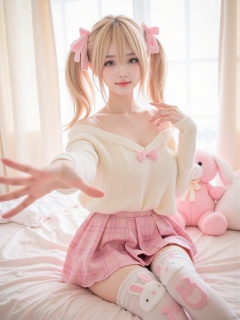 Realistic photo, 1girl, double ponytails, fair skin, big breasts, cute off-shoulder sweater, bow, plaid skirt, bunny-decorated stockings, upper body, cute bedroom, pink stuffed toy, curtains, (one hand stretching out long), making a domineering gesture,