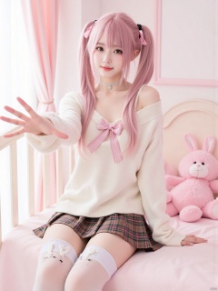 Realistic photo, 1girl, double ponytails, fair skin, big breasts, cute off-shoulder sweater, bow, plaid skirt, bunny-decorated stockings, upper body, cute bedroom, pink stuffed toy, curtains, (one hand stretching out long), making a domineering gesture,