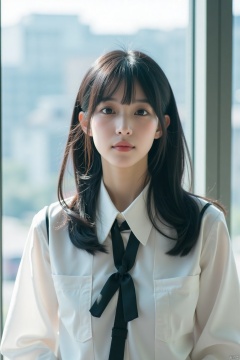Polaroid style filters,Retro film style,a young Asian woman stands in front of a window. She is dressed in a white button-down shirt with a black collar and a black bow tie. The woman's hair is long and cascades over her shoulders, framing her face. She has a serious expression on her face, adding a pop of color to the scene.