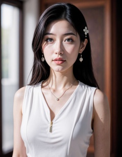1girl, solo, jewelry, realistic, black hair, breasts, earrings, necklace, looking at viewer, upper body, lips, cleavage, chinese clothes, blurry, blurry background, mole, long hair, dress, hair ornament, medium breasts, parted lips, white dress, nose, blue eyes, collarbone, mole on breast, indoors, white shirt, shirt,