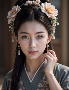 cinematic, 1girl, solo, earrings, jewelry, realistic, looking at viewer, long hair, brown hair, blurry background, hair ornament, flower, blurry, hair flower, hair bun, portrait, closed mouth, chinese clothes, blue eyes, upper body, hanfu