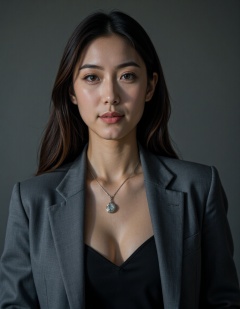 cinematic film still cinematic, 1girl, solo, jewelry, breasts, realistic, cleavage, necklace, long hair, brown hair, brown eyes, looking at viewer, lips, jacket, formal, suit, upper body, medium breasts, grey background, simple background, grey jacket, shirt, black shirt, smile, closed mouth, nose . shallow depth of field, vignette, highly detailed, high budget, bokeh, cinemascope, moody, epic, gorgeous, film grain, grainy