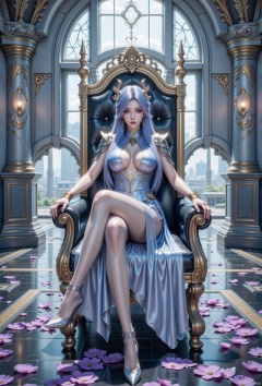 1girl, solo, long hair, breasts, looking at viewer, blue eyes, hair ornament, dress,(up_skirt:1.2), flesh colored pantyhose,glossy pantyhose,sitting, blue hair, full body, boots, armor, high heels, petals, chair, high heel boots, throne,Future Technology Space Station,cyberpunk,plsw
