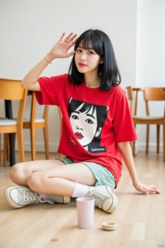a medium-sized Asian woman is seated on a light-colored wooden floor. She is dressed in a short-sleeved red t-shirt, adorned with a black and white graphic of a woman's face. Her left hand is raised in the air, adding a pop of color to her face. The woman's hair is long, straight, and she's wearing a pair of light green shorts. Her sneakers are adorned with white socks and a white sock with a red stripe. A white coffee mug is placed on the floor in front of her. The backdrop is a stark white wall, with a wooden table and chairs behind her.
