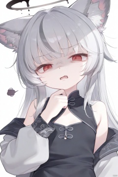 1girl,animal ears,solo,long hair,grey hair,halo,simple background,upper body,white background,looking at viewer,bangs,jacket,dress,long sleeves,black dress,open mouth,animal ear fluff,multicolored hair,streaked hair,disgust,chinese clothes,sleeveless,