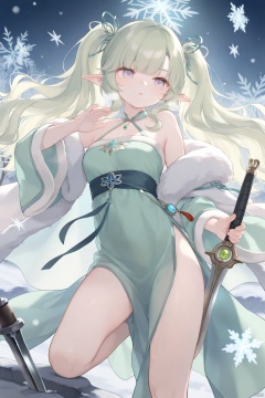 masterpiece, best quality, newest, absurdres, highres, 1girl, solo, (pale green hair:1.1), light purple eyes, wavy curls, straight bangs, cirle curls, asymmetrical bangs, pointy ears, elf, meigetsu twintails qixiong ruqun, hanfu, snowflakes, fur-trimmed cloak, jian (weapon), dynamic pose, floating hair, battle, snowfield, underlighting, strong visual impact, film lighting, night
