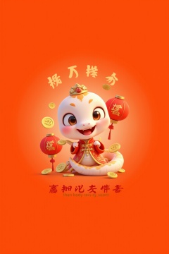 1snake,This is a digital CGI advertisement for the Chinese New Year, featuring a cute, white, cartoonish snake with large, expressive eyes and a playful expression. The snake wears traditional red Chinese attire with intricate patterns and a golden crown. Red paper lanterns and gold coins float around, enhancing the festive atmosphere. The background is a warm, gradient orange, and the text in the top half is in Chinese characters, with English text underneath. <lora:IP-蛇宝宝FLUX:0.8>