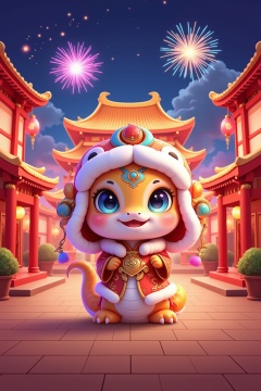 1snake,This vibrant digital illustration depicts a traditional Chinese holiday night, with an adorable, Chinese-style anthropomorphic snake character in the middle of the frame celebrating the Chinese New Year. The character has large, expressive blue eyes, a fluffy white hat with red and blue ornaments, and festive attire against a backdrop of a brightly lit, ornate temple with red lanterns, gold ornaments, and a pagoda-like roof. Fireworks burst in the starry sky, casting a festive glow, and the clean and tidy streets add to the lively atmosphere. The painting is rich in detail and color, capturing the essence of the joyous celebration. <lora:IP-蛇宝宝FLUX:0.8>