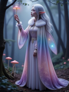 Deep in the misty forest, the light and slender elf is ethereal and beautiful. She has ankle-length silver hair interspersed with light blue crystals, her skin is white and glowing, and her violet eyes are deep and smart. Wearing a colorful silk cloak, as thin as cicada wings, the light and shadow change, pink and purple are intertwined, white feathers are soft on the collar and cuffs, and a bright starry sky is painted on the tail. She raises her hand to touch the fluorescent mushroom, her eyes are curious, and her whole body is full of dreamy atmosphere. It seems to be involved in a beautiful dream. , A Bow-Chinese style cloak