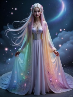 In the ethereal and boundless spiritual realm, a graceful and graceful elf quietly emerged. Her figure is light, as if she is not touched by the fireworks of the world, her movements are poetic, and her long and gorgeous hair is like a flowing rainbow waterfall, pouring down from the top of her head. Smart starlight fragments danced between the hair, and dreamlike light spots flickered continuously. The skin is like clear glass, exuding a soft and holy halo, the facial features are exquisite beyond imagination, and the eyes are like violet whirlpools, hiding endless fantasy secrets. The cloak she wears is made of phantom light yarn taken from the edge of dreams. It is as light as nothing, yet radiant. The background color is a deep and mysterious blue, like the deep sea at night, but in the blink of an eye, there are rose ripples and mint green waves, and the color changes like magic. The neckline is surrounded by dream-like rime down, each one shining with frost-like crystal light, a strange blend of coolness and warmth. The cuffs are decorated with flexible butterfly wing fragments, as thin as cicada wings, and the breeze blows, There are colorful butterflies fluttering their wings Wanting to fly, on the back of the cloak, a suspended castle in the sky is embroidered with stardust. Pegasus shuttles among the clouds, and there is an aurora sky that never ends. The elf tiptoes lightly, and the cloak flutters fiercely, making the surrounding air filled with dreams. The sweet fragrance , A Bow-Chinese style cloak