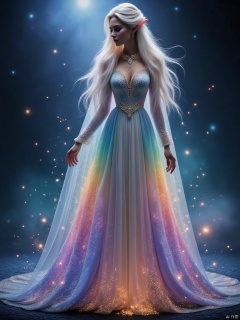 In the ethereal and boundless spiritual realm, a graceful and graceful elf quietly emerged. Her figure is light, as if she is not touched by the fireworks of the world, her movements are poetic, and her long and gorgeous hair is like a flowing rainbow waterfall, pouring down from the top of her head. Smart starlight fragments danced between the hair, and dreamlike light spots flickered continuously. The skin is like clear glass, exuding a soft and holy halo, the facial features are exquisite beyond imagination, and the eyes are like violet whirlpools, hiding endless fantasy secrets. The cloak she wears is made of phantom light yarn taken from the edge of dreams. It is as light as nothing, yet radiant. The background color is a deep and mysterious blue, like the deep sea at night, but in the blink of an eye, there are rose ripples and mint green waves, and the color changes like magic. The neckline is surrounded by dream-like rime down, each one shining with frost-like crystal light, a strange blend of coolness and warmth. The cuffs are decorated with flexible butterfly wing fragments, as thin as cicada wings, and the breeze blows, There are colorful butterflies fluttering their wings Wanting to fly, on the back of the cloak, a suspended castle in the sky is embroidered with stardust. Pegasus shuttles among the clouds, and there is an aurora sky that never ends. The elf tiptoes lightly, and the cloak flutters fiercely, making the surrounding air filled with dreams. The sweet fragrance , A Bow-Chinese style cloak