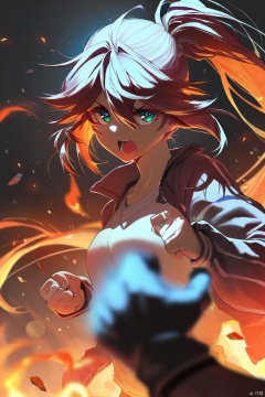 cracked screen, kakao_rantan,[[[artist:ttosom]]],mochizuki_kei,[[[artist:qys3]]],artist:riichu,damda,yoneyama mai,cutesexyrobutts,(wlop:0.6),[artist:ningen_mame],[[tianliang duohe fangdongye]], clenched hand,punching,imminent punch,fighting stance,incoming attack},incoming punch,fire,upper body,blurry foreground,open mouth, best quality,amazing quality,very aesthetic,absurdres,year 2023,year 2024, backlight,high contrast,colorful,detailed light,sunlight,shine on girl's body,cinematic lighting,