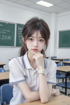 a young Asian girl with long brown hair is seated in a classroom. She is wearing a white short-sleeved polo shirt with a blue stripe on the collar, and a white watch on her wrist. Her left hand is resting on her chin, and her left hand rests on her hip. Her hair is pulled back in a ponytail, adding a touch of texture to her face. The backdrop is a stark white wall, with two chalkboards, one of which is green and the other is white. Adjacent to the green chalkboard is a row of desks, each with blue chairs.