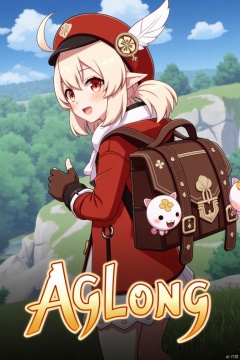 Klee from Genshin Impact, 1girl, solo, long light brown hair with low twintails, bangs, ahoge, and sidelocks, red headwear with a hat ornament and feather, red eyes, smiling with an open mouth, looking back at the viewer, wearing a red coat, brown gloves, scarf, and a backpack with a bag charm, holding Jumpy Dumpty and Dodoco, pointy ears, clover print details, standing in a dynamic pose, cinematic lighting, three-dimensional text 'AGlong' centered below, movie poster theme, vibrant colors, detailed composition, fantasy adventure atmosphere.