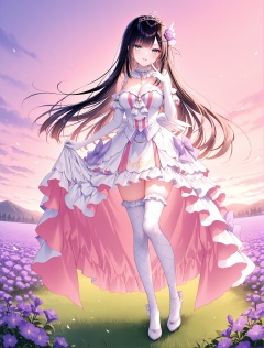 masterpiece, best quality, newest, absurdres, highres,(toosaka asagi: 0.5),(hiten \(hitenkei\):0.4),(rimuu:0.5),(mignon:0.5),(sheya:0.6),light smile,open mouth, ensemble style, sumire(ensemble),1girl,green eyes,black hair,long hair,purple flower hairpin,bangs,aquaidol, white thighhighs, frilled dress, two-tone dress, print thighhighs, frilled thighhighs,elbow gloves,tiara,finger to face, outdoors,,Flower field,full body,standing,shoes,<lora:sumireXLNAI:1>,<lora:aquaidolXLNAI:1>