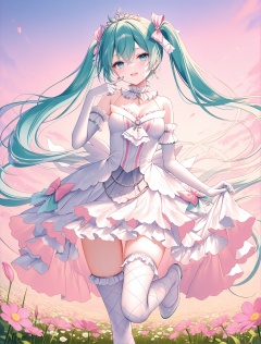 masterpiece, best quality, newest, absurdres, highres,(toosaka asagi: 0.5),(hiten \(hitenkei\):0.4),(rimuu:0.5),(mignon:0.5),(sheya:0.6),light smile,open mouth, 1girl,hatsune miku, aquaidol, white thighhighs, frilled dress, two-tone dress, print thighhighs, frilled thighhighs,elbow gloves,tiara,finger to face, outdoors,Flower field,standing on one leg,arm up,<lora:aquaidolXLNAI:1>