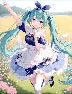 masterpiece, best quality, newest, absurdres, highres,(toosaka asagi: 0.5),(hiten \(hitenkei\):0.4),(rimuu:0.5),(mignon:0.5),(sheya:0.6),light smile,open mouth, 1girl,hatsune miku,   frilled dress, aquawonder, two-tone dress,blue dress, print thighhighs, white thighhighs, finger to face, outdoors,Flower field,standing on one leg,arm up,<lora:aquawonderXLNAI:1>