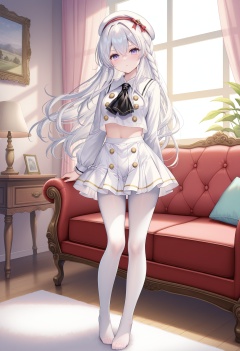 masterpiece, best quality, newest, absurdres, highres,(torino aqua: 0.5),(nibiiro shizuka:0.4),(rimuu:0.5),(mignon:0.5),(sheya:0.4), Mai(Ensemble), purple eyes, braid, long hair, white hair, hair between eyes,janus(school), white skirt, miniskirt, crop top, long sleeves,school uniform, white serafuku, neckerchief,white pantyhose,looking at viewer, full body, no shoes, standing,living room, <lora:maiXLNAI:1>,<lora:Janus(Uniform)XLNAI:1>