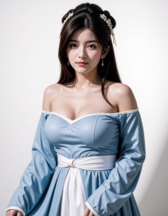 1girl, solo, dress, long hair, hair ornament, breasts, bare shoulders, chinese clothes, jewelry, earrings, realistic, hair bun, blue dress, looking at viewer, sash, off shoulder, upper body, white dress, brown hair, parted lips, black hair, cleavage, large breasts, long sleeves