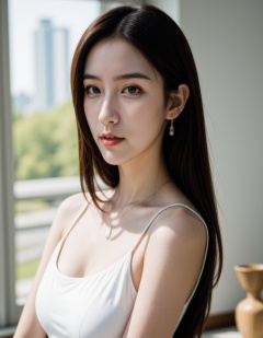 1girl, jewelry, solo, earrings, realistic, long hair, looking at viewer, blurry background, blurry, indoors, office, brown hair, lips, photorealistic, upper body, day, from side, sleeveless, nose, depth of field, necklace, breasts, tree, white dress, looking to the side, sunlight, closed mouth